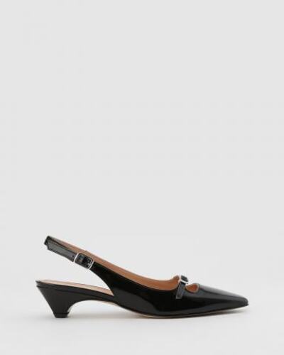 Чёрные туфли с открытой пяткой Principe di Bologna добавят утонченности в повседневные и деловые образы. Модель выполнена из натуральной лакированной кожи, на каблуке высотой 35 мм. Внутри подклад и стелька также из кожи. Стопу фиксирует ремешок на пятке с регулируемой застежкой. Также декоративный ремешок добавлен на передней части. Туфли можно стилизовать с юбками и платьями разных фасонов.