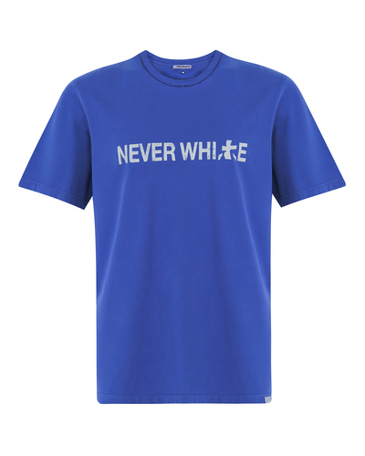 Синюю футболку из мягкого хлопка украсили спереди крупной белой надписью Never White, в которой литеру t заменили фирменным иероглифом. Принт выглядит так, словно частично стерся со временем. Состаренный вид модели придают и небольшие потертости по краям рукавов и вдоль выреза. Сзади изделие дополнили узором Blu Premiata.