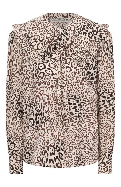 Блуза из струящегося шелка с леопардовым принтом застегивается пуговицами, украшенными кристаллами. Модель с прямоугольными манжетами дополнили узкой оборкой на воротнике «Питер Пэн» и лентами, завязывающимися на горловине.