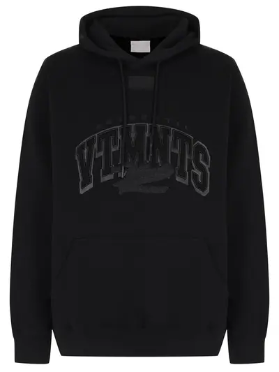 -Черное худи-оверсайз из хлопка от VETEMENTS. -Модель свободного кроя со спущенной линией плеча, длинными рукавами, рельефными манжетами и поясом, накладным карманом-кенгуру, капюшоном на кулиске, вышитым логотипом бренда спереди в тон.
