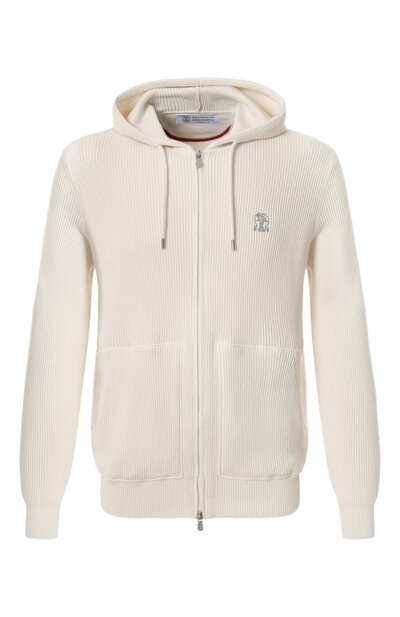 Кардиган с регулируемым капюшоном, накладными карманами и застежкой на встречную молнию вошел в коллекцию Travelwear. Модель из чистого хлопка связали в технике английской резинки. О принадлежности марке говорит вышитая эмблема Solomeo.