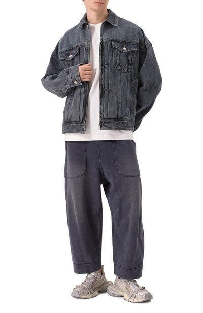 Джинсовую куртку силуэта oversize сшили из плотного хлопкового денима с декоративными потертостями. Модель, застегивающуюся молнией и пуговицей, дополнили двумя накладными и парой врезных карманов.