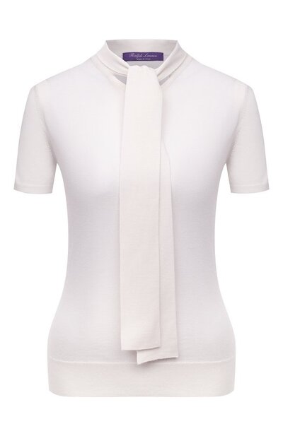 Пуловер с короткими рукавами может стать альтернативой блузе в офисном наряде. Спокойный кремовый цвет и воротник аскот с длинными лентами, которые можно завязать бантом или оставить свободно ниспадать, не будут противоречить нестрогому дресс-коду. Для изготовления модели из весенне-летней коллекции Ральф Лорен выбрал тонкий нежный кашемир, почти не ощущающийся на теле.