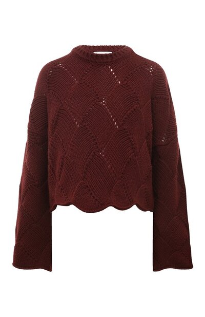 Свободный укороченный свитер оттенка спелой вишни делает особенно комфортным материал. Модель с широким рукавами связали графичным плетеным узором, используя мягкую шерсть мериноса, усиленную прочным акрилом. Такое изделие поддерживает оптимальный микроклимат и не вытягивается со временем. Принадлежность марке Джонатан Андерсон подчеркнул брендированным кожаным патчем сзади.