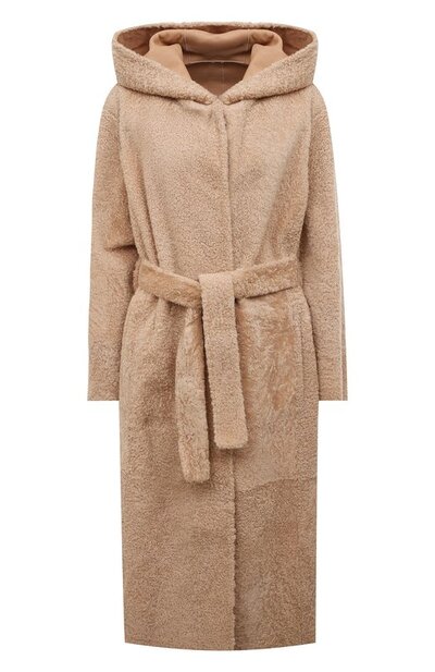 Для создания бежевой шубы с глубоким капюшоном команда марки использовала мягкую овчину, которую тонко выделали вручную, чтобы сделать легче и эластичнее. Модель лишили подкладки, поэтому она лучше садится по фигуре и не сковывает движения. В комплекте — длинный пояс-лента, подчеркивающий талию.