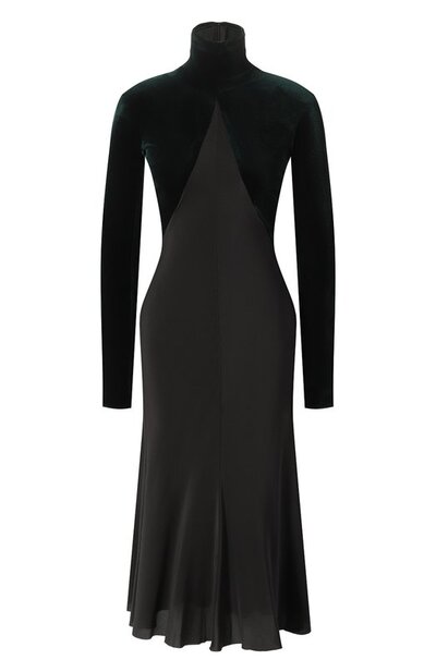 В создании женственного образа вещам с приталенным силуэтом нет равных. Для такого платья Хайдер Акерманн выбрал сочетание черного легкого струящегося крепа и темно-зеленого фактурного бархата. Модель из осенне-зимней коллекции 2018 года напоминает изделие с надетым поверх жакетом болеро. Образовавшаяся клиновидная деталь спереди зрительно вытягивает фигуру.