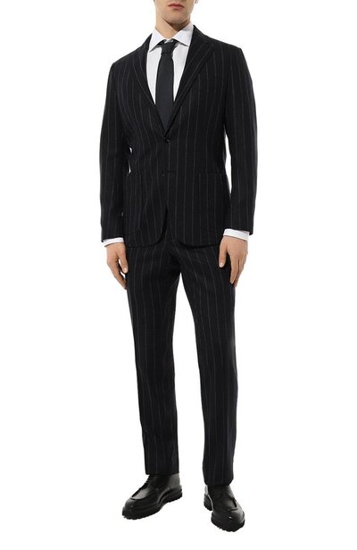Темно-синий костюм в меловую полоску сшили из отборной шерсти с добавлением тонкого дышащего хлопка. Изделия из такого пластичного материала садятся точно по фигуре и долго сохраняют безупречный вид. Приталенный пиджак с широкими прямоугольными лацканами и выверенной линией плеч делает силуэт более статным, а благодаря двум шлицам сзади не сковывает движения.