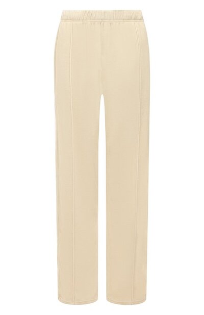 Для пошива брюк использовали мягкий хлопковый велюр, укрепленный нитями полиэстера. Модель с простроченными стрелками и эластичным поясом дополнили парой карманов.