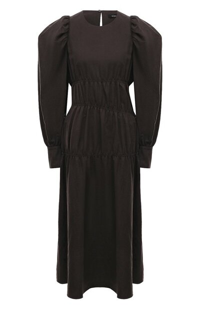 Миди-платье оттенка крепкого кофе сшили из тонкого, но прочного твила на основе дышащего тенселя. Мягкая ткань с деликатным шелковистым блеском почти не мнется и хорошо драпируется, формируя естественные скульптурные складки. Женственнее модель делают длинные объемные рукава буфф и узкая эластичная вставка, несколько раз опоясывающая изделие.