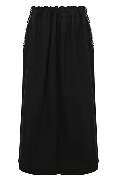 Черную миди-юбку делают наряднее перламутровые бусины, подчеркивающие прорезные карманы, а непринужденный вид ей придает эластичный пояс, дополненный широкой белой вставкой. Для пошива изделия с разрезами по бокам использовали плотную ворсистую шерсть.
