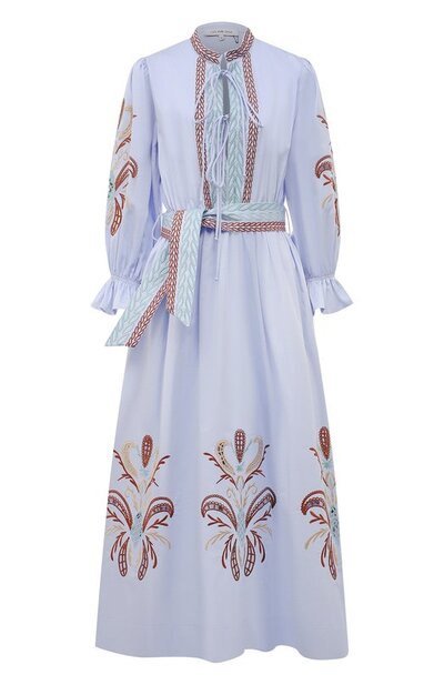 Голубое миди-платье украсили знаковой для бренда этнической вышивкой. Ее шелковистый блеск только выиграл от фона: модель выполнили из мягкого тонкого хлопка с гладкой матовой поверхностью. Из этой же ткани изготовили и длинный широкий пояс, формирующий приталенный силуэт.