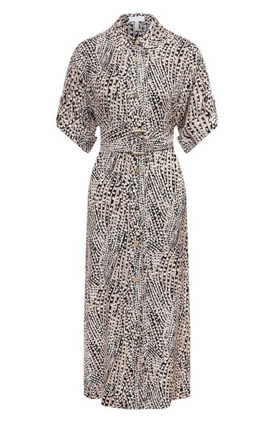 Для пошива бежевого платья-рубашки с широкими короткими рукавами использовали легкую дышащую вискозу с абстрактным черно-белым принтом. В комплект вошел широкий пояс с пряжкой-кольцом, подчеркивающий талию. Модель застегивается по всей длине брендированными пуговицами.