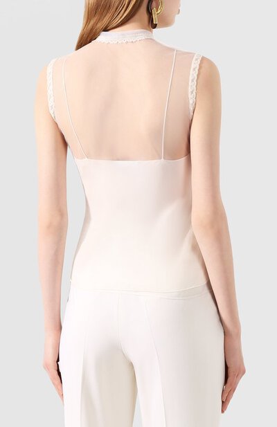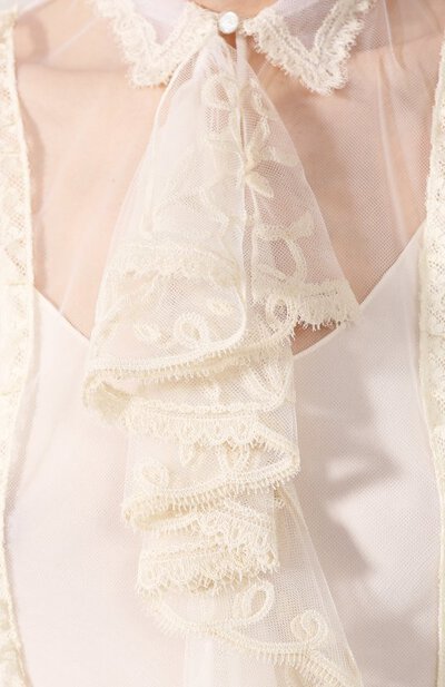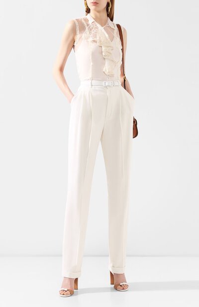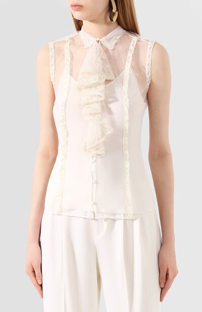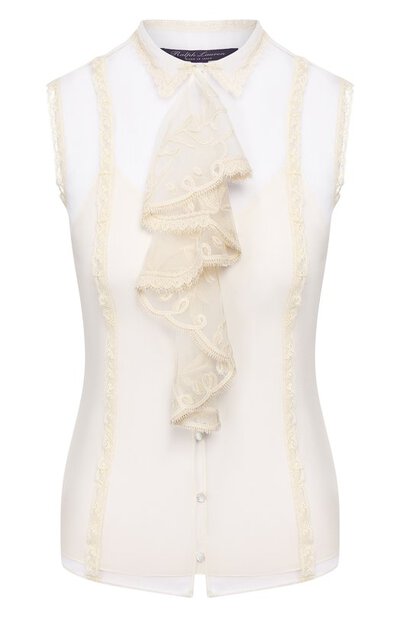 В сезоне весна-лето Ральф Лорен в очередной раз продемонстрировал виртуозное умение объединять в одной вещи женственные черты и детали, позаимствованные у мужского гардероба. Например, воротник этого топа напоминает о сорочке для смокинга, а за романтический флер отвечают полупрозрачный фатин, объемное жабо и отделка из ажурного кружева.