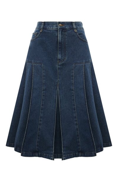 Для изготовления синей миди-юбки мастера марки использовали прочный деним средней плотности. Модель с завышенной посадкой дополнили вставками с широкими складками, создающими эффект крупной плиссировки. Изделие в готовом виде обработали вручную, чтобы создать деликатные потертости, которые со временем станут более выраженными.