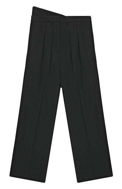 Для пошива черных брюк свободного кроя использовали мягкую плотную ткань с добавлением вискозы и эластана. Такой материал почти не мнется, поэтому изделие долго выглядит безупречно. Модель с асимметричным поясом и заниженной шаговой линией дополнили стрелками и защипами, создающими небольшие складки.