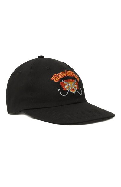 Черную бейсболку с прямым козырьком украсили спереди разноцветной вышивкой в стиле карма-гадри. Мотив Abundance Dragon создал художник Таши Маннокс. Для изготовления аксессуара с регулируемым ремешком использовали плотный хлопковый габардин.