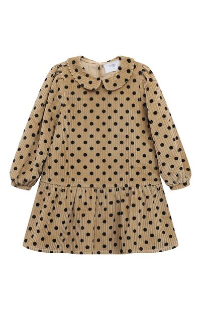 Для пошива бежевого платья в черный горох использовали приятный на ощупь хлопковый вельвет. Такой бархатистый материал с плотным переплетением нитей сохраняет тепло в прохладную погоду. Объемные рукава вдоль пройм и манжет собрали в небольшие защипы, с которыми перекликаются легкие складки на подоле.
