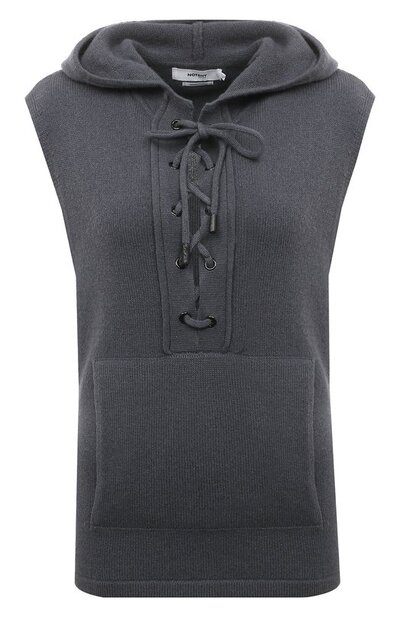 Спортивные черты в виде глубокого капюшона и кармана «кенгуру», как у худи, дизайнеры марки привили темно-серому жилету с корсетной шнуровкой спереди. Для изготовления модели использовали нежную пряжу из волокон кашемира, промытого в родниковой воде для особой мягкости. Изделие хорошо сохраняет тепло и не ограничивает движения.