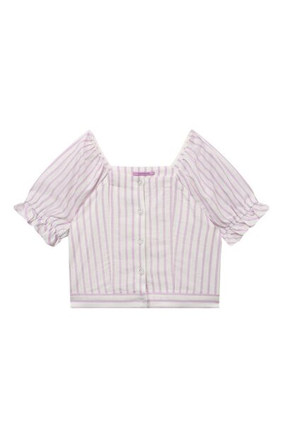 Мастера марки сшили сиреневый полосатый топ из мягкой, приятной на ощупь ткани, сотканной из нежной шелковистой вискозы и гладкого льна. Модель из такого материала хорошо пропускает воздух, сохраняя ощущение комфорта даже в знойный день. Изделие с квадратным вырезом и рукавами-фонариками застегивается пуговицами спереди.
