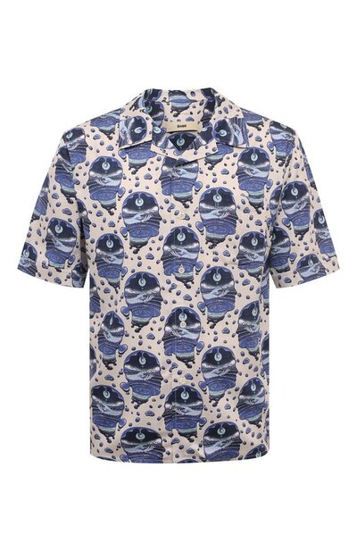 Синюю рубашку с короткими рукавами мастера марки сшили из тонкой шелковистой вискозы с крупным паттерном в виде человеческого профиля, в контуры которого вписали принт с изображением руки. Такая модель с легкостью сыграет роль первой скрипки в образе, но мы предлагаем сочетать ее с парными брюками.