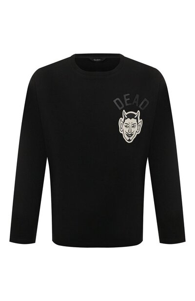 Черный лонгслив с круглым вырезом сшит из гладкого тонкого джерси. Эластичный материал из длинноволокнистого прочного хлопка Supima отлично пропускает воздух, а одежда из него не пилингуется и не теряет со временем заданную форму. Однотонная модель прямого кроя украшена спереди крупным принтом и надписью.