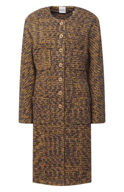 В сине-золотистом пальто из весенне-летней коллекции сочетали внешнюю эстетичность и комфорт. Модель с четырьмя накладными карманами изготовили из смесового трикотажа, стилизованного под твид, и не использовали подкладку, поэтому вещь получилась легче аналогов и не сковывает движения. Почти все этапы по ее созданию выполнили вручную, например, пришили рельефные пуговицы.