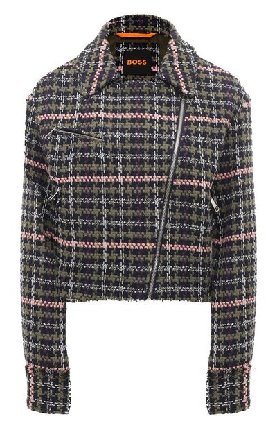 Для пошива темно-зеленой косухи с широким лацканами и карманами на молниях использовали фактурный хлопковый твид в розовую клетку. Плотную непродуваемую ткань укрепили прочным полиэстером, поэтому куртка хорошо держит форму. Края отворотов на манжетах оставили необработанными, сформировав бахрому.