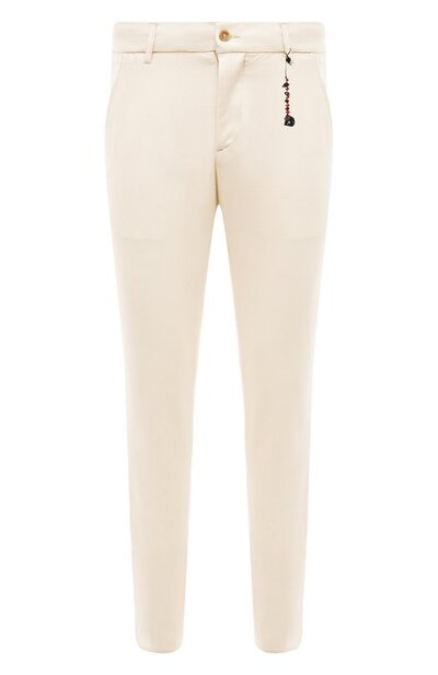 Прямые кремовые брюки в исполнении Марко Пескароло получились особенно комфортными. Для пошива модели со стрелками использовали тонкую ткань из нежного кашемира, который поддерживает оптимальную температуру и на улице в холодную погоду, и в теплом помещении. На одной из шлевок закрепили фирменный съемный брелок с маской Пульчинеллы.