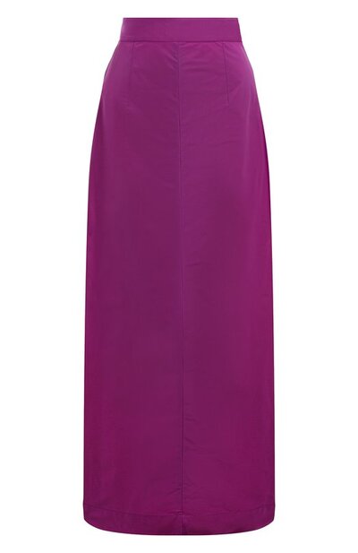 Макси-юбка насыщенного сиреневого цвета автоматически станет главной деталью любого комплекта. Модель с широким плоским поясом и высоким разрезом сзади сшили из мягкой прочной тафты. Ее характерный сатиновый блеск добавляет оттенку глубину, а изделию — игру полутонов.