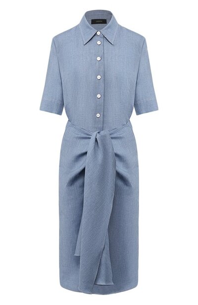 Одним из спецэффектов в весенне-летней коллекции марки, основанной Джозефом Эттедги, были драпировки, которые имитировали завязанные поверх бедер шарфы. Такой использовали и при создании платья-рубашки из плотной ткани на базе льна. Благодаря синему неоднородному цвету материал напоминает деним. Эта вещь будет хорошо смотреться и с туфлями, и с кедами.