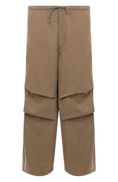 Дизайнеры бренда сделали брюки цвета хаки более объемными за счет широких складок в области колена. Для пошива модели использовали мягкую плотную ткань из тщательно очищенного хлопка и шелковистого нейлона, придающего прочность. Посадку изделия на талии легко регулировать шнуром, продетым в пояс-кулиску.