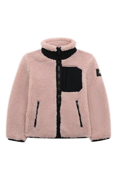 Для пошива розовой куртки использовали фактурный текстиль, стилизованный под овчину с густым плотным ворсом. Изделие из такого материала не продувается ветром и защищает от холода. Роль цветового акцента отдали черным молниям, вставке на воротнике-стойке, манжетам, поясу и карману спереди. Принадлежность марке обозначили черной брендированной нашивкой на левом рукаве.