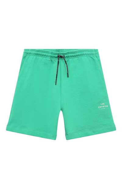 Ярко-зеленые шорты сшили из мягкого дышащего трикотажа на основе органического хлопка с добавлением переработанного. Свободный крой изделия не сковывает движения, а широкий регулируемый пояс-кулиска, как у джоггеров, обеспечивает комфортную посадку на талии. Спереди модель украсили небольшим белым принтом в виде логотипа.