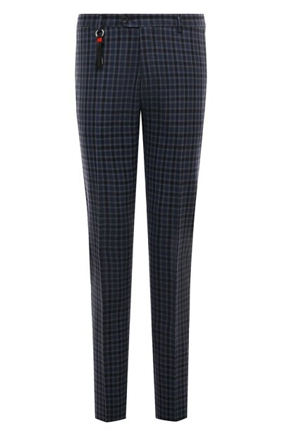 Темно-синие клетчатые брюки наши стилисты предлагают носить с однотонными вещами, чтобы не перегрузить образ. Для пошива изделия с четырьмя карманами использовали мягкую плотную ткань из отборной шерсти, которая приятно ощущается на теле. В комплекте — брелок с деталью в виде фирменной маски Пульчинеллы.