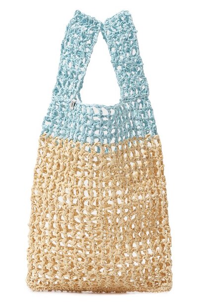 Бежевую сумку, верх которой выделили голубым оттенком, мастера марки сплели вручную из гибкой тонкой рафии. Полотно изготовили так, чтобы получился ажурный узор. Внутрь аксессуара с широкими ручками поместятся бутылка воды, кошелек и футляр с очками.
