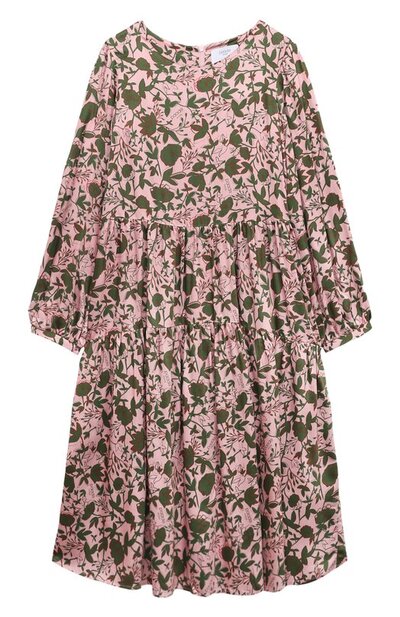 Для пошива розового платья с длинными рукавами использовали нежную хлопковую ткань: тонкий текстиль отлично пропускает воздух и приятно ощущается на коже. Модель с потайной молнией и расклешенным двухъярусным подолом украсили зеленым растительным принтом, в который мягко вписали фирменный логотип.