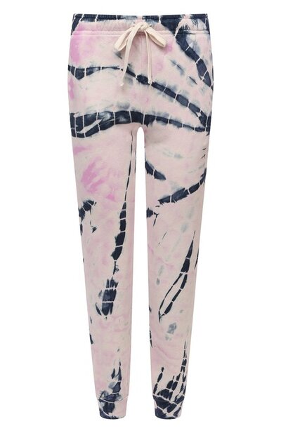 Чтобы создать абстрактный разноцветный узор на джоггерах из весенне-летней коллекции, их окрасили в технике тай-дай. Вторую такую вещь не получится сделать даже специально, поэтому модель из мягкого хлопкового джерси получилась уникальной. Для пошива изделия использовали приятный на ощупь трикотаж на основе шелковистой вискозы и мягкого хлопка.