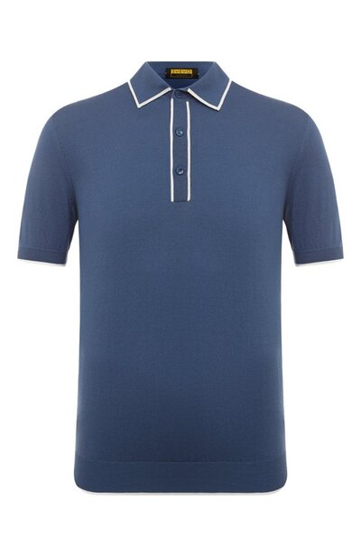 Синее поло выполнили из приятного на ощупь трикотажа, для производства которого использовали хлопок ценных сортов. Его гладкие волокна сделали материал похожим на шелк, поэтому модель получилась исключительно мягкой. Роль декора на себя взял белый кант, которым подчеркнули отложной воротник, манжеты и пояс.