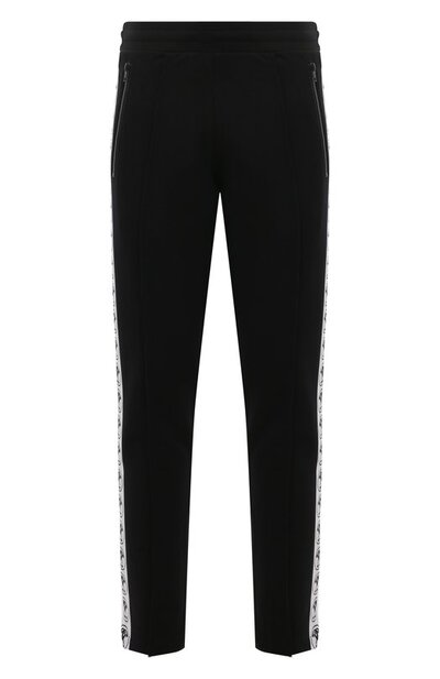 Для пошива черных брюк с эластичным поясом мастера марки использовали мягкий хлопковый трикотаж. Спереди модель дополнили рельефными стрелками, сместив их к бокам. Широкие белые лампасы подчеркнули паттерном в виде эмблемы Double Question Mark. Мотив поддерживает узор на кармане сзади.