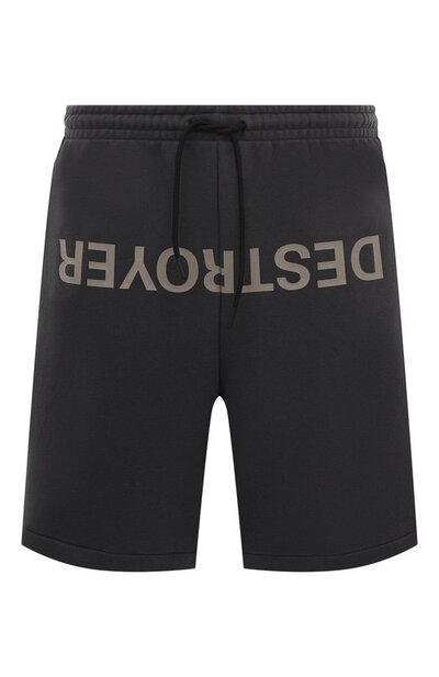 Темно-серые шорты свободного кроя выполнили из приятного на ощупь материала на основе дышащего хлопка. Чтобы изделие меньше мялось и лучше держало форму, в состав добавили полиэстер, при этом использовали переработанные волокна. Модель с боковыми карманами и регулируемым поясом-кулиской украсили спереди крупной перевернутой надписью Destroyer.