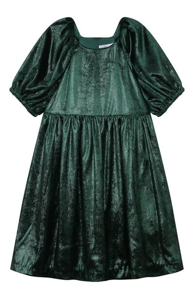 Платье изумрудного оттенка о цвета сшили из мягкой бархатистой ткани с мягким блеском, а для максимального комфорта изделие дополнили подкладкой из нежной вискозы. Модель свободного кроя с короткими рукавами-фонариками и высокой линией талии застегивается пуговицей сзади