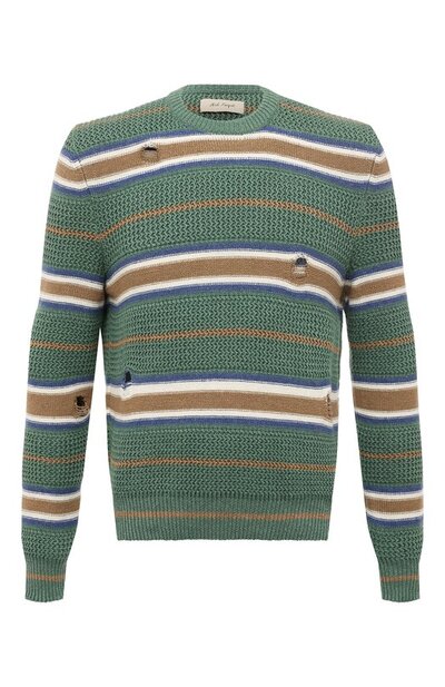 Мастера марки связали зеленый свитер из фактурной пряжи, в которой сочетали тонкий лен и отборный хлопок. Материал с таким составом поддерживает комфортную для тела температуру как в помещении, так и на улице. Разноцветный полосатый мотив и разрывы, сформированные спущенными петлями, добавляют изделию динамики и делают его более расслабленным.