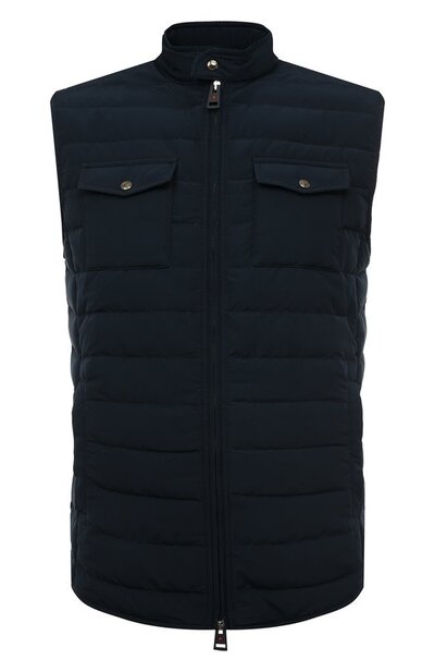 В темно-синем жилете будет комфортно в холодные дни. Изделие с накладными карманами спереди сшили из прочного непродуваемого текстиля на основе мягкого хлопка. Стеганую модель наполнили отборным гусиным пухом с добавлением пера. Утеплитель почти ничего не весит и не создает излишний объем, но при этом поддерживает оптимальную температуру.