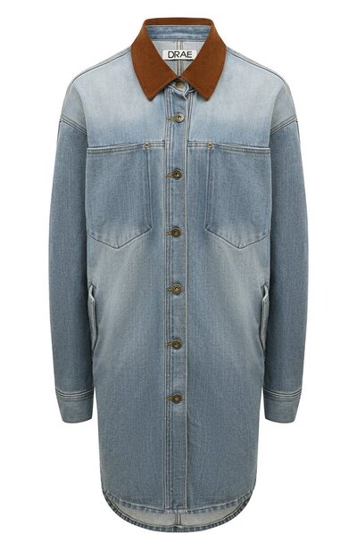 Голубую удлиненную куртку с закругленным асимметричным низом, как у рубашки, сшили из мягкого тонкого денима. Модель в готовом виде обработали вручную, чтобы придать ей выбеленный эффект и потертости, как у вещи с длинной историей. Акцентной деталью сделали отложной воротник, продублировав его коричневым вельветом.