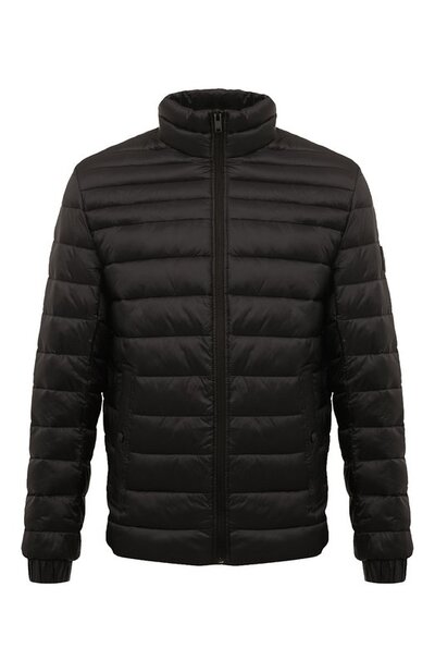 Стеганую куртку универсального черного цвета сшили из гладкого непродуваемого нейлона с водоотталкивающим покрытием. Для изготовления материала использовали переработанные остатки текстильного производства, что помогло сэкономить первичные ресурсы. Утепленную модель с воротником-стойкой и боковыми карманами украсили небольшой фактурной нашивкой с логотипом на левом рукаве.