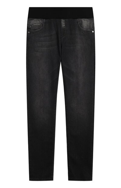 Черные облегающие джинсы из осенне-зимней коллекции 2018 года дополнены широким трикотажным поясом-резинкой в тон. Брюки, для пошива которых Пьетро Брунелли выбрал мягкий хлопок стрейч с потертостями, могут стать основой расслабленного повседневного образа.