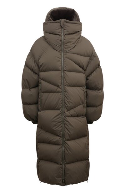 Для пошива темно-зеленого пуховика использовали плотный непродуваемый текстиль. Наполнитель из отборного утиного пуха с добавлением пера равномерно распределили по стеганым камерам, поэтому в изделии будет тепло в морозную погоду. Для дополнительной защиты от холода и ветра предусмотрели глубокий капюшон и высокий воротник.