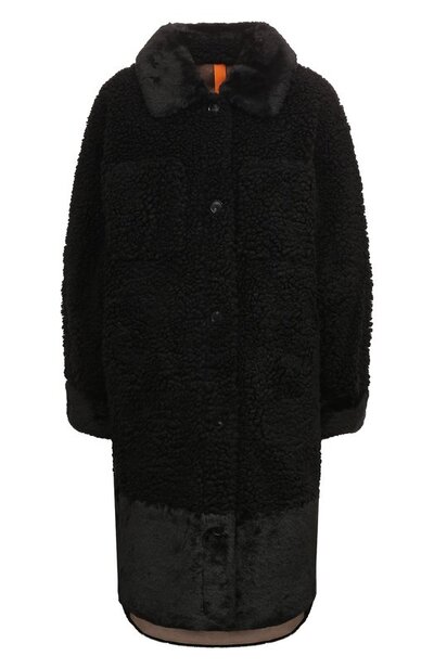 Черное пальто стилизовали под шубу. Для пошива изделия свободного кроя мастера марки, основанной Хуго Фердинандом Боссом, использовали два вида мягкого плотного материала. Один напоминает матовую короткостриженую овчину, а второй — шелковистый мех с деликатным блеском. Из него выполнили отложной воротник, манжеты и вставку снизу.