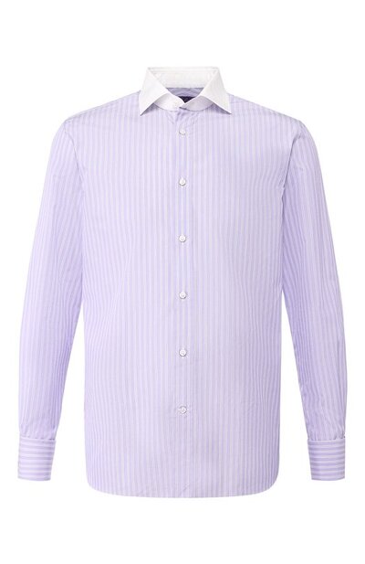 Ральф Лорен включил в осенне-зимнюю коллекцию лиловую рубашку в полоску. Изделие с длинными рукавами и белоснежным воротником кент произведено из мягкого тонкого хлопка. Легкий шелковистый материал хорошо пропускает воздух, поэтому в изделии будет комфортно весь день.