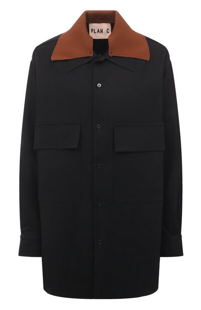 Прямая черная рубашка сможет заменить легкую куртку или жакет в прохладную погоду. Для пошива модели мастера марки использовали прочный шерстяной габардин, который хорошо удерживает тепло и долго сохраняет безупречный вид. Изделие с фигурным низом дополнили накладными нагрудными карманами с клапанами и трикотажной коричневой вставкой, создающей эффект двухслойного отложного воротника.